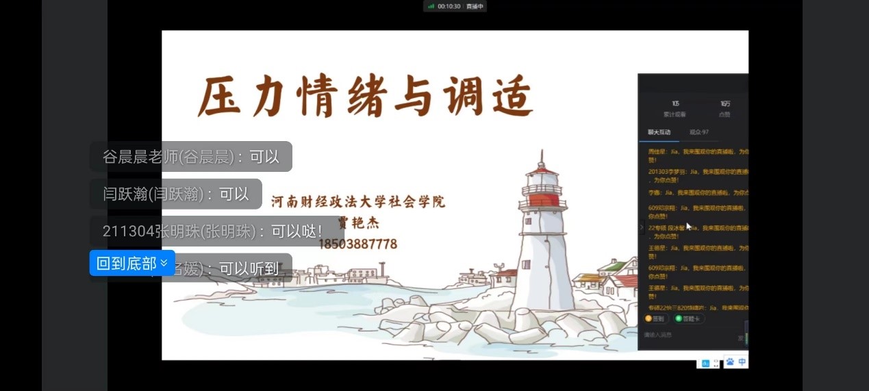 11月5日,999策略手机论坛版资助专管员谷晨晨组织并召开家庭经济困难学生心理健康线上交流活动,999策略手机论坛版全体学生参与。会议由999策略手机论坛版心理学兼心理辅导老师贾艳杰主讲。